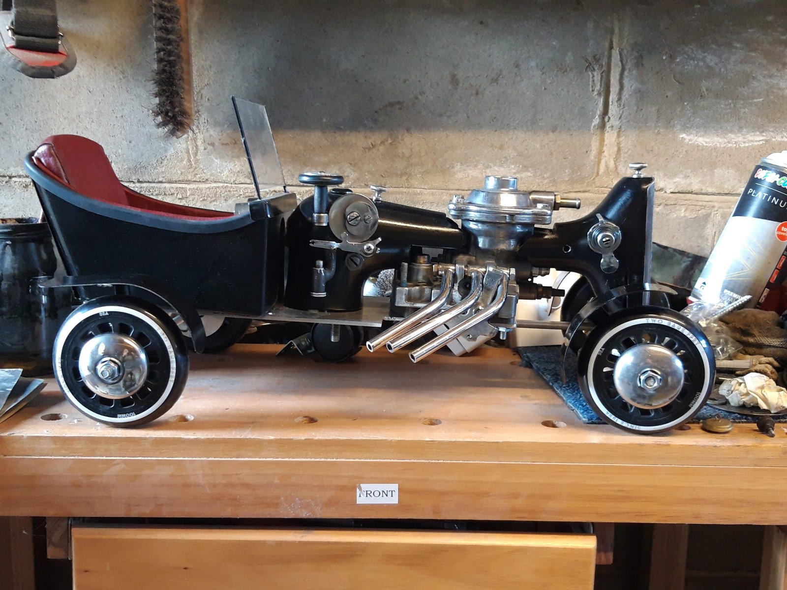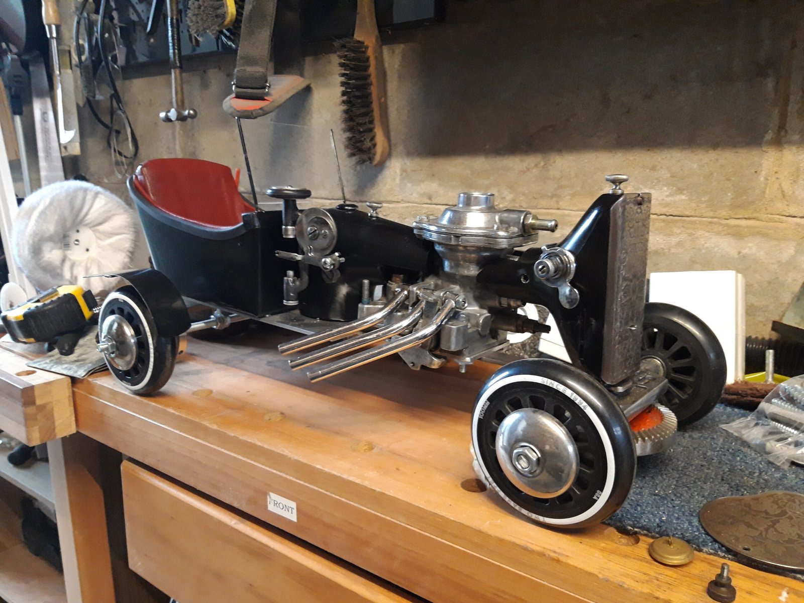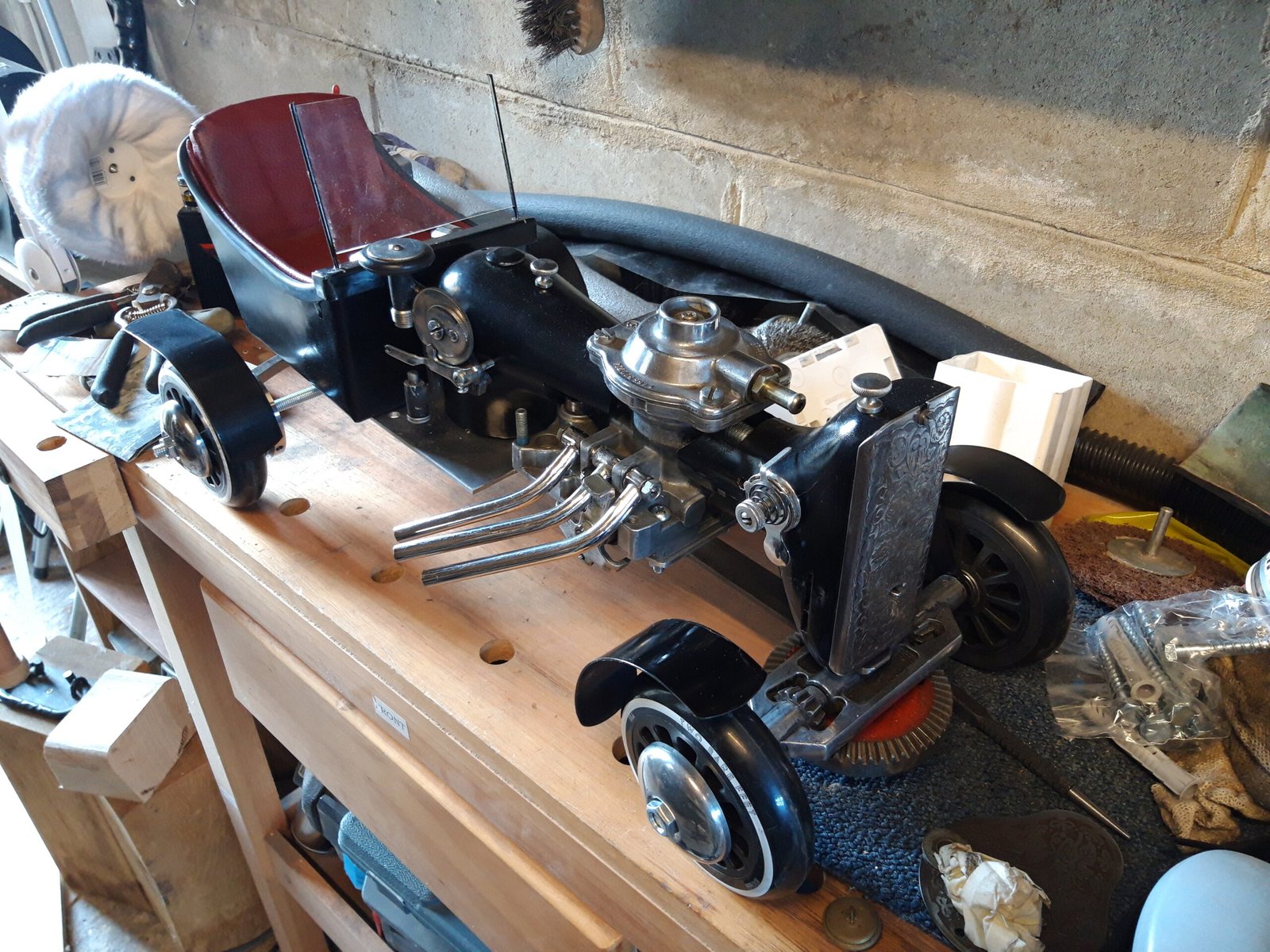 Vintage Singer sewing machines were designed for work and longevity but are also decorative objects in themselves in sleek black designs. They have a rich industrial history both in factories and in the home. While built to last even the strongest of tools can stop working. These defunct machines remain beautiful but broken so they are ideal to turn into a sculpture. Using a variety of old fashioned industrial found objects this project quickly lent itself to a vintage racing car design.